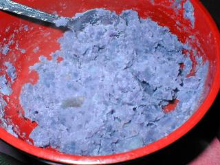 潰してみた。牛乳を加えて練れば紫色の洋風きんとんに。好みで砂糖やシナモンを加えてもよい。 |