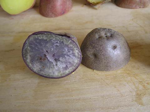 1990年に北海道農業試験場で作られた品種で、インカレッドとは母親が同じ異父兄弟にあたる品種なんだって。上の写真では皮が乾いてしまったので黒っぽく見えているけれど、水洗いした直後は皮も鮮やかな紫色だった。 |