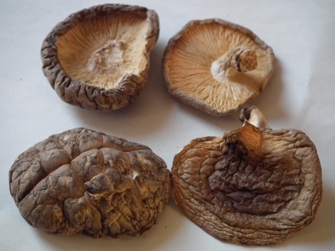 ![]() こちらは「どんこ」です。冬の茸という意味の漢字をあてますが、「こ」の字がSHIFT-JISに入っていないのでこのページでは表示できません。姑にくさかんむりをかぶせた文字です。肉厚で笠がひらききっていないのが特徴です。冬の寒い時期に栽培し、ゆっくり育つので肉厚になるそうです。一般に香信よりも高級だとされています。