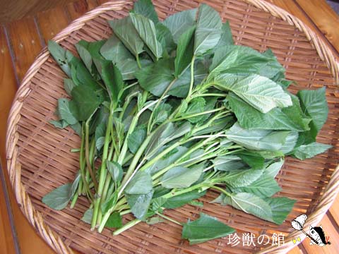 これがモロヘイヤである。日本で食用にする野菜と雰囲気が違うので、最初はとっつきにくいかもしれないが、食べてみると苦みやえぐみはまったくない。葉を摘んで天麩羅にしたり、細かく刻んでスープにいれたりする。刻むとオクラのような粘りが出て面白い。