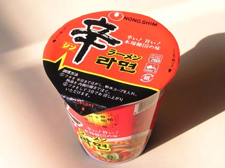 2006年 98円で購入 いつの頃からか辛ラーメンにはカップも出回っている。大小二種類あって、これは小さいもの。日本のカップヌードルと同じくらいの大きさだ。韓国語パッケージもあるはずなのだが近所の店で見かけるのは日本語パッケージ。 スープが別袋なのは、カップを開けたときにトウガラシ粉の目潰し攻撃にあわないようにするための工夫だろうか。 完成品の写真 味は袋とほぼ同じだと思うが麺が違う。これはこれで美味しいけれど、スープと一緒に煮込む袋タイプのほうが麺に味がなじんで好きだ。