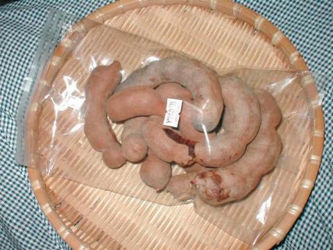 | タマリンドには、料理の味付けに使う酸味のつよい品種と、果物として食べる甘い品種がある。写真のものは甘くてほとんど酸味のない品種。東南アジアの市場では、果肉だけ取り出して団子状にして売っているらしい。今回は殻付きのものを入手した。 |