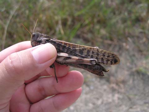 2007年10月13日撮影@浅川土手 これもたぶんトノサマバッタです。葛飾ではなく、浅川という八王子方面の川でつかまえたものです。トノサマには緑色型と黒色型と、赤茶っぽい褐色型がいるそうですが、黒色と褐色はビミョーな違いなので、どっちも褐色でいいんじゃないかと個人的には思います。写真のものは強いていえば黒色……いや、褐色?? どっちでしょう。