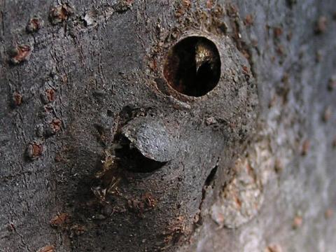 2003年10月1日撮影 わりと新しい繭をみつけました。家主が出ていった直後らしく、蓋(ふた)も残っているし、蛹の抜け殻も残っています。ふしぎなことに、イラガの仲間の繭は、こんなふうにパックリきれいに蓋があくようにできています。しかも、かならず上をむいて蓋があくのが決まりです。 |