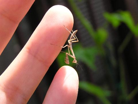 2003年7月5日撮影 指先に乗るほど小さなカマキリの幼体。もう少し大きくならないと種類はよくわからないが、コカマキリではないかとにらんでいる。 |