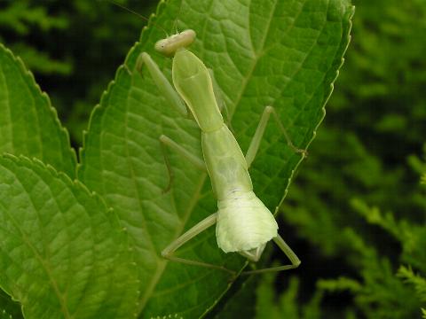 2003年8月6日撮影 もっとも、腕の模様なんか確認しなくたって、この広い腹と尻上げポーズはどう考えてもハラビロカマキリなんだけど。オオカマキリやチョウセンカマキリに、こんな色っぽいポーズができるわけがないし(できたらどうしよう)。