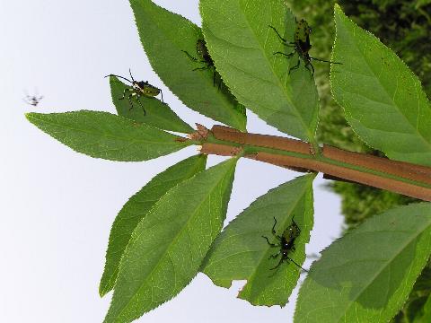 | 指先で触角をちょちょいとつっつく。あわてて葉の表に逃げるカメムシ。臨海公園で見た個体より体つきがカッチリしている。一頭ずつ別の葉の裏に隠れているのも先月見たのとちがっている。こっちの方が少しだけオトナなのかもしれない。