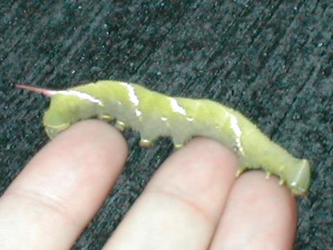 捕まえてみた。体長は 5cm くらいだろうか。スズメガ科の蛾の幼虫であることはまちがいないけれど、名前がわからなかった。