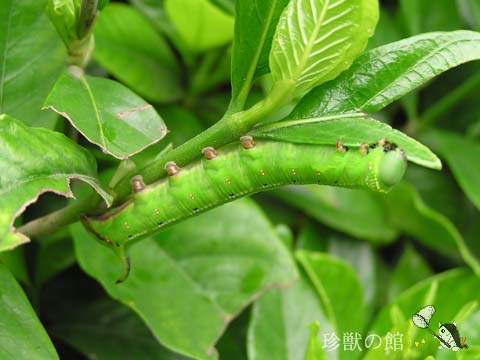科名 スズメガ科 学名 Cephonodes hylas 中名 大透翅天蛾 蜂蛾 撮影日 2004/06/11 撮影地 東京都葛飾区 特徴 ・体長 55mm くらい ・緑色で寸胴、頭は丸くて大きい ・尻に刺のような突起がある ・クチナシの葉を食べる 刺に見えるものはただの飾りで刺すことはないし毒もない。
