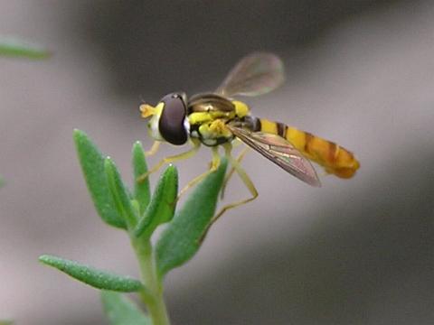 科名 ハナアブ科 学名 Sphaerophoria menthastri 中名 ? 別名 マメヒラタアブ? 撮影日 2003/07/15 撮影地 東京都江戸川区 特徴 ・胸部背面がオリーブ色で縦線 3 本 ・胸部の両サイドが黄色 ・腹の模様が薄い ・体つきが細い ・ホソヒメヒラタアブより小型 ・両眼がくっついてる→オス キタヒメヒラタアブというのとも似てるけど、そっちはホソヒメヒラタアブより大きいらしい。腹の模様が薄いのでヒメヒラタアブと判断したが、ひょっとするとホソヒメのオスかもしれない。アブは難しいなあ。
