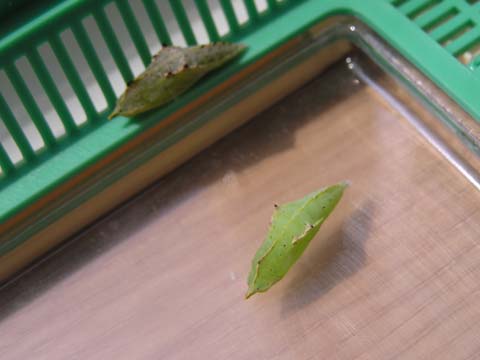 モンシロチョウはまわりの色にあわせた色の蛹を作る。不透明な枠の部分にくっついているやつは濃いくすんだ緑色をしているし、透明な部分にくっついている蛹は、透明感のある明るい黄緑だ。