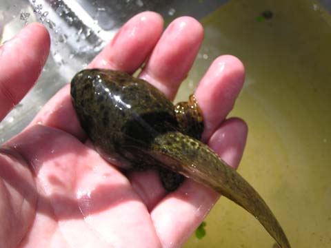 巨大オタマは小さいのにくらべて数が少なく、捕まえるのはそれなりに大変だ。人影を見るとあっという間に潜っていってしまう。 網を用意してしばらく待っていると、また水面に上がってくるのでそこを狙った。 体長は11cmくらい。写真というのは錯覚をおこしやすい。こうして手と比較した写真ですら、実物の巨大さを伝えきっていないように思える。 |