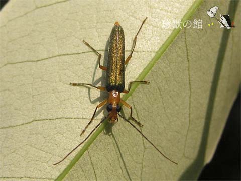科名 カミキリモドキ科 学名 Xanthochroa waterhousei 中名 ? 撮影日 2005/05/25 撮影地 東京都葛飾区 特徴 ・体長 20mm くらい ・頭・胸・足は飴色で、前翅は緑色で鈍い光沢がある。 ・触角が糸状で長く、体型がカミキリムシに似ているが、小さい。 乱暴に扱うと体液を出すが、これにはカンタリジンという毒があり、触れると水ぶくれになって痛がゆい。捕まえる時は充分に注意すること。