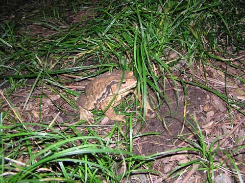 亜種名 アズマヒキガエル 別名 ガマガエル(蝦蟇蛙) 科名 ヒキガエル科 学名 Bufo japonicus formosus 中名 蟾蜍 撮影日 2007/08/1 撮影地 東京都葛飾区 特徴 ・目の後ろから体の側面に黒い帯状の斑がある。 ・背中に無数のイボがある。 ・水中ではなく林の中の乾いたところで夜見かける。 ニホンヒキガエルのうち、近畿以東の本州と山陰地方にいる亜種がアズマヒキガエル、それより西のほうにいる亜種はサツマヒキガエル(ニホンヒキガエル)。