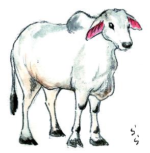 インドでは昔から飼われている家畜用の牛。背中にこぶがあり、首の下に肉ひだがある。耳が赤いのも特徴的だ。 |