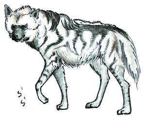 | 虎のようで、犬頭で、体色が白く、イノシシのたてがみを持つ……とくれば、ぴったりくるのはシマハイエナだろう。