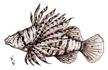 水中にシュウシュウの魚が多く、そのかたちは鵲(かささぎ)のようで十枚の翼があり、すべての羽の端にウロコがあり、その声は鵲のよう。火をふせぐのによく、食べれば黄疸にならない。(北山経一の巻) 絵・文とも『山海経』より |