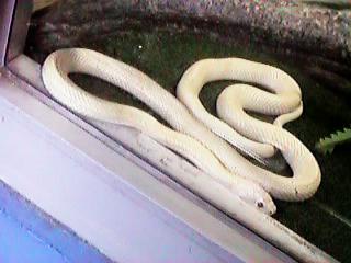 本来は色のついた生き物がなにかのきっかけで白くなって生まれる奇形をアルビノというが、蛇にももちろんアルビノはいる。瞳にも色素がないので目が赤く、血液の赤が皮膚を透けて見えるので白というより黄金色にも見える。