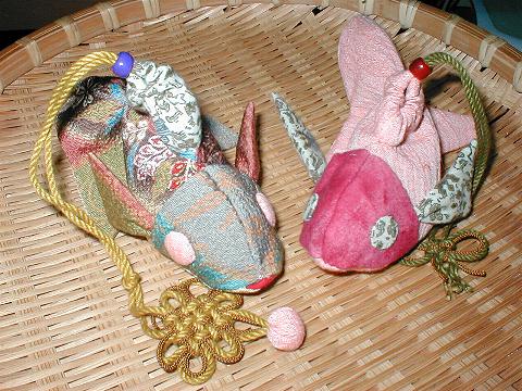布で作った金魚の琴爪入れ 布で作った小さな巾着袋に、中国結びの紐をつけてみました。金魚のぬいぐるみのようですが、ちゃんと巾着袋になってます。左の金魚は縮緬(ちりめん)の風呂敷を切って作ったもの。右はあり合わせの布を使いました。