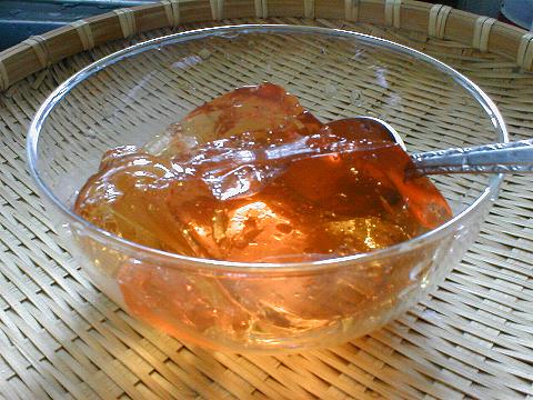 わざとゼラチンを少なめにしてあります。型ぬきしないで、おおきなスプーンですくってガラスの器に盛りつけたりすると涼しい感じ。