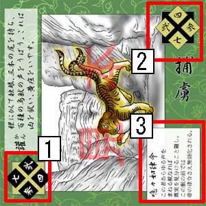 次に[2]の赤い四角の中を見てください。[1]と同じような漢数字が四つ、横倒しの状態で書かれています。これは、このカードが「敵の捕虜」になった時に使います。捕虜についてはゲームの基本ルールの中で説明します。 最後に[3]の赤い四角の中を見てください。この部分はカードの特殊効果について説明する部分です。この部分がないカードもあります。