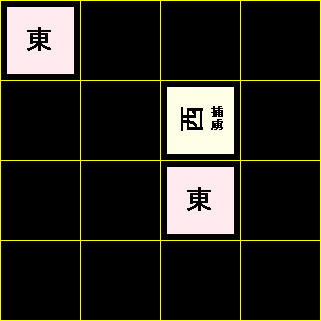 東のプレイヤーが西のプレイヤーのカードの前に、自分のカードを置きました 。 このような場合は、東が「攻撃」をして、西が「防御」することになります。 この部分を拡大してみましょう。 |