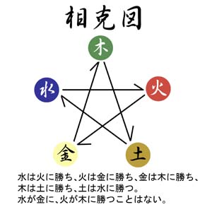 左の図を相克図(そうこくず)といいます。中国の五行説によれば、よのなかのあらゆることがらは、火・水・木・金・土の五つの属性で表すことができると言われています。 相克図は、それぞれの属性が、どの属性に対して強い(弱い)か説明したものです。