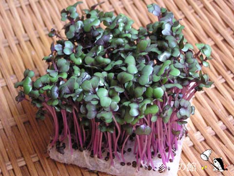 赤キャベツの種を発芽させたもの。カイワレ大根の赤キャベツ版である。芽のうちから茎が赤く、葉の部分にも紫の色素があるようで、うっすら色づいている。育って玉になった赤キャベツに辛みはないと思うが、芽には大根下ろしに似た辛みがある。