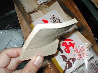 左の写真は島豆腐と呼ばれる沖縄の木綿豆腐で、見た目にはわからないがズッシリと身が詰まっている。 |