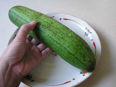 皮をむいて豚肉と一緒に炒めてみた。実がぐずっとして味をよく吸い込む。ヘチマでタワシを作ったことのある人は「あのスジっぽいものが食べられるの?」と思うかもしれないが、熟す前の若いヘチマは意外なことにやわらかくて美味しい。 |