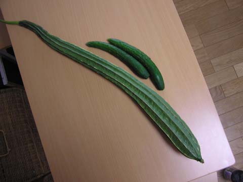 こーんなに大きくなった(クリックでキュウリとの比較写真)。途中で入院などしてまるで世話できなかったから、大きいのは見た目だけで、実はあんまり発育がよくない。食べるとこ少なそう。 |