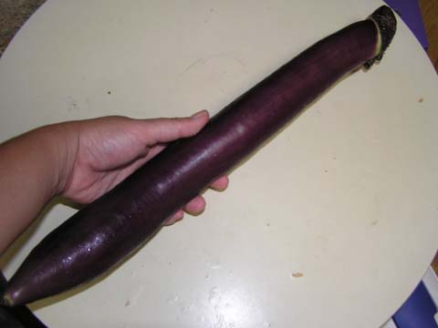 2本つないで切り口を手で隠してるわけじゃないぞ。 長さは 25cm 以上。太さもかなりあるので、普通の茄子の 4〜5本分のボリューム。 |