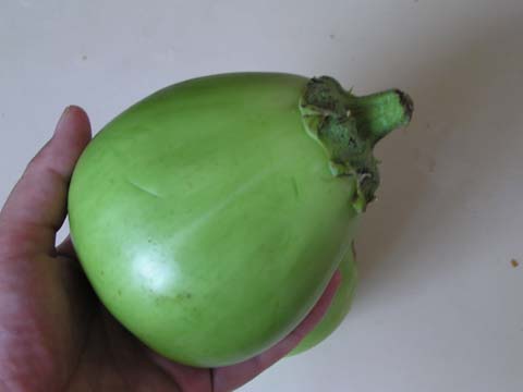 タイ国産の輸入野菜で、これとよく似た色と形でもっと小さな青ナス(白ナス?)があるけれど、それは非常に固くて使いにくかった記憶がある。 |