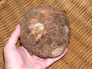 里芋には、親芋を食べる種類と、子芋を食べる種類と、親芋も子芋も食べられる種類があって、セレベスは親子ともども食用になる品種である。 この写真ではわかりにくいが、丸いだけでなくかなりの大きさである。直径 10cm くらいだろうか(写真クリックで手との比較)。 |