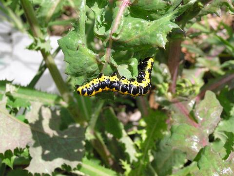 2003年10月20日撮影 葉っぱから引っぺがすと、くるんと丸くなってしまいました。ヨトウガ類の幼虫も捕まえようとすると同じポーズをします。たぶん石ころにでも化けてるつもりなんでしょう。しばらく見てましたが、ずっと死んだふりをしてました。 |