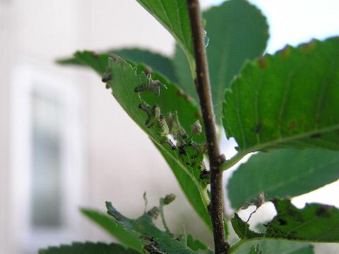 でも、経験からいって、こいつは蝶や蛾ではなくハバチの仲間なんです。バラにつくチュウレンジバチの幼虫にそっくり。チュウレンジバチはバラの葉しか食べませんからよく似た別の虫でしょう。 ニレ科の葉につくハバチには、その名もニレチュウレンジというのがいます(わかりやすいけど芸のない名前)。たぶん、そいつの幼虫じゃないでしょうか。
