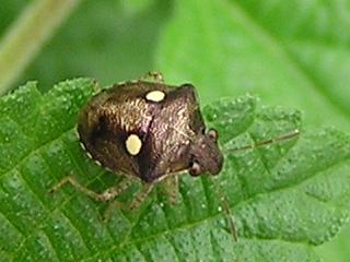 カメムシの仲間は、色や形、大きさが多様でおもしろい。アカスジキンカメムシの幼体など、背中の模様がどうみても笑っているし、この写真のものも帽子をかぶった人の顔のように見える。 |