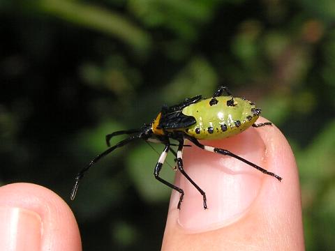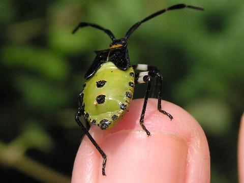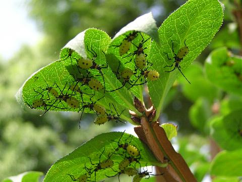 | 立ち止まってしゃがみ込み、ためつすがめつ茂みの中に目をこらすと、いた。キバラヘリカメムシの幼体がいっぱい。しかも手が届くほどの距離だ。