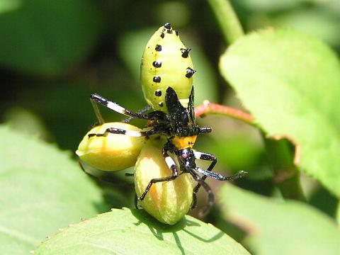 | 黒・黄緑・白の強烈な色分けは、やはり鮮烈な印象をはなっているけれど、横から見ると腹も平たくて、最初にこれを見たらアブラムシと見間違うことはなかっただろう。