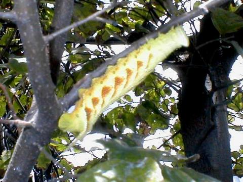 | 体長は 5cm くらい。つんとたった尻尾の先まで黄色い。写真にも写っているけれど、体全体に細かいぼつぼつがあって、絞りの布みたい。ウンモンスズメの幼虫とも似ているけれど、体の模様がちがっている。 |
