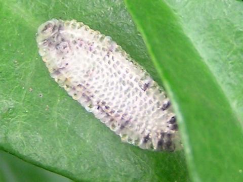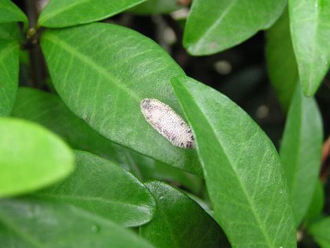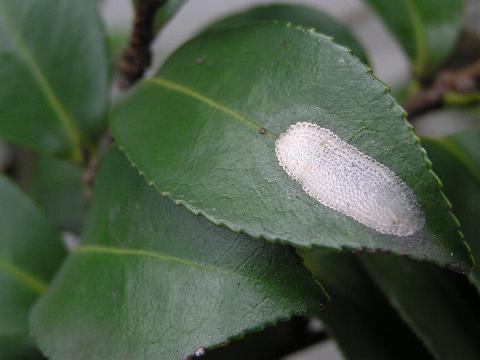 科名 ハマキガ科? 学名 ? 中名 ? 撮影日 2003/07/17 撮影地 東京都江戸川区 特徴 ・平たくて半透明 ・鱗状にビッシリ並んでいる ・長楕円形にきれいに並んでいる ハマキガ類の卵かと思うんだけど、ひょっとするとイラガ類の卵かもしれない。写真の葉はサザンカ。