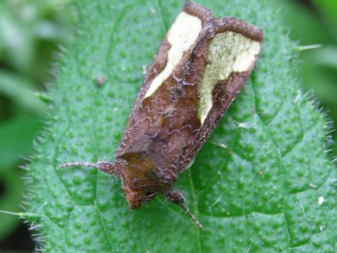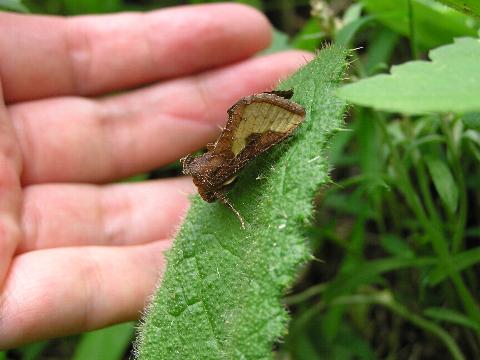 科名 ヤガ科 学名 Diachrysia intermixta または Trichoplusia intermixta 中名 中金翅夜蛾 撮影日 2003/08/02 撮影地 東京都中央区 特徴 ・翅は薄い緑で枯れたような縁取りがある 日のあたる場所で見ると翅が金色に輝くらしい。浜離宮恩賜庭園にて。写っている葉はキク科の何かだと思う。