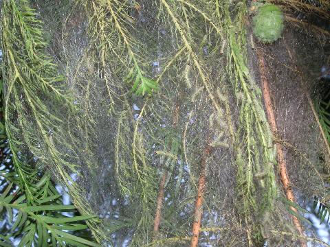 科名 ヒトリガ科 学名 Hyphantria cunea 中名 米國白蛾 撮影日 2003/08/10 撮影地 東京都葛飾区 特徴 ・白い毛虫で背中に黒い点が線状にならんでいる ・若幼虫のころは木の葉を糸でつづりあわせて巣をつくり集団で暮らす 写っている木はラクウショウ。アメリカシロヒトリが針葉樹につくのは珍しい気がするので自信はない。
