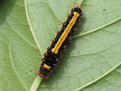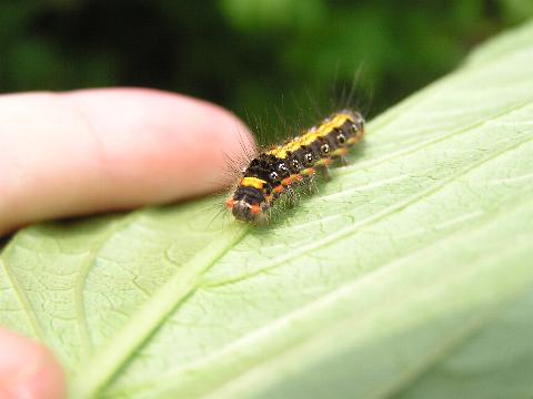 科名 ドクガ科 学名 Euproctis similis 中名 桑斑褐毒蛾、紋白毒蛾、桑毒蛾、黄尾毒蛾…など 幼虫:桑毛虫、金毛虫 撮影日 2003/07/16 撮影地 東京都江戸川区 特徴 ・漆黒のビロードに黄色や赤のモールを取り付けたような派手な色 ・体は短め、毛が生えている 名前のとおり毒毛があるらしいので触らないほうが無難。西日本には黒い部分の少ない個体もいるらしい(別名クワノキンケムシ)。