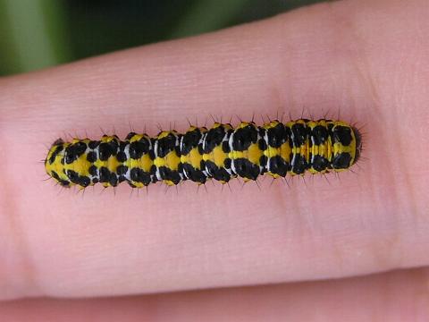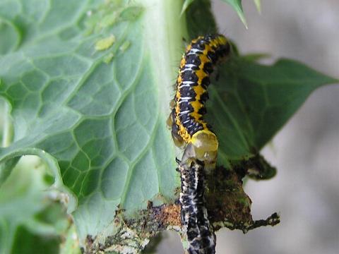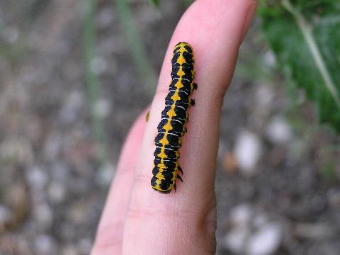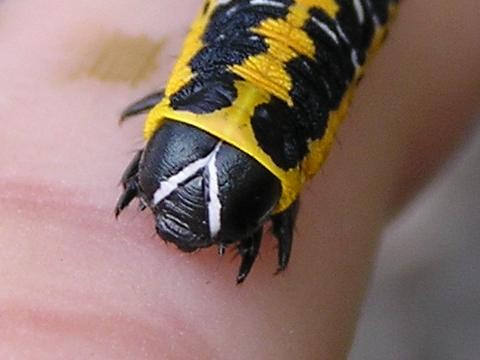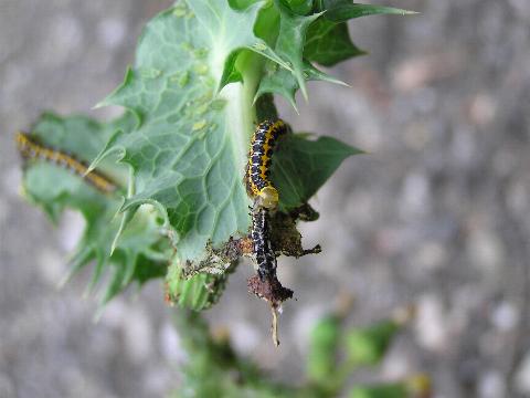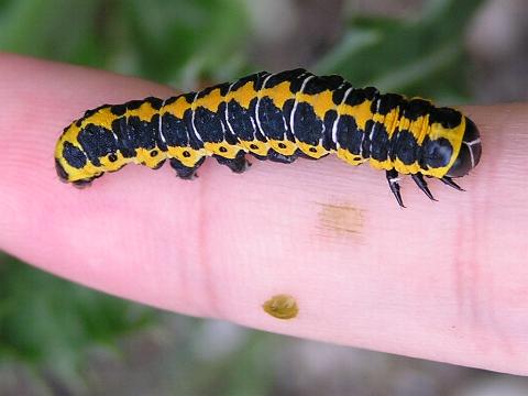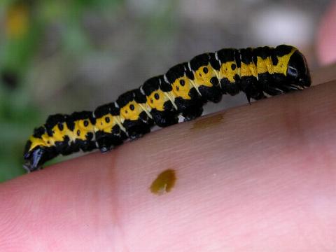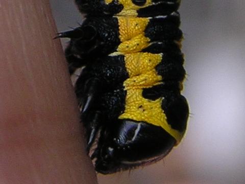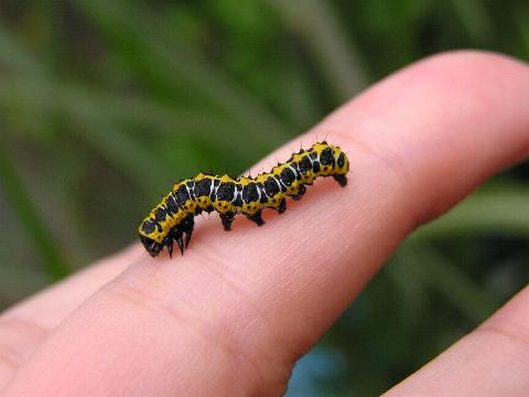 科名 ヤガ科 学名 Cucullia fraterna 中名 萵苣冬夜蛾 撮影日 2003/10/10 撮影地 東京都江戸川区 特徴 ・黒と黄色の強烈な色 ・アキノノゲシなどキク科の葉を食べる 他の写真 [1][2][3][4] [3][4]は脱皮直後 2003/10/15