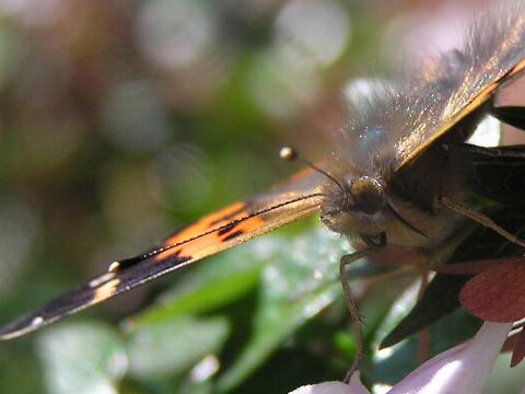 科名 タテハチョウ科 学名 Vanessa indica 中名 紅[虫夾]蝶 撮影日 2003/10/24 撮影地 東京都江戸川区 特徴 ・前翅の表は黒とオレンジの斑文 ・後翅の表は褐色で縁以外に模様がない ・後翅の裏は灰褐色に白の網目模様 |