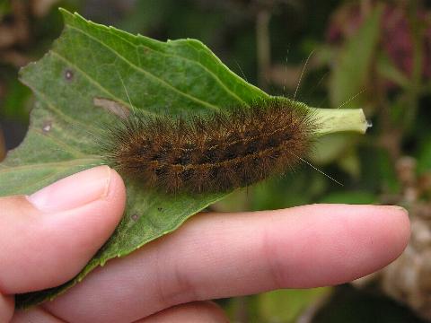 科名 ヒトリガ科 学名 Spilarctia seriatopunctata 中名 ? 撮影日 2003/10/27 撮影地 東京都江戸川区 特徴 ・体長 50mm 程度 ・茶色の毛が生えている ・頭と尻に白く長い毛が数本ずつ ・アジサイの葉を食べている たぶんスジモンヒトリだと思う。だとしたら成虫はかなり特徴のある虫なので育ててみれば一目瞭然なのだが…