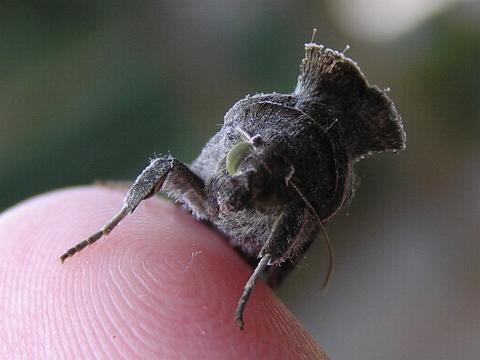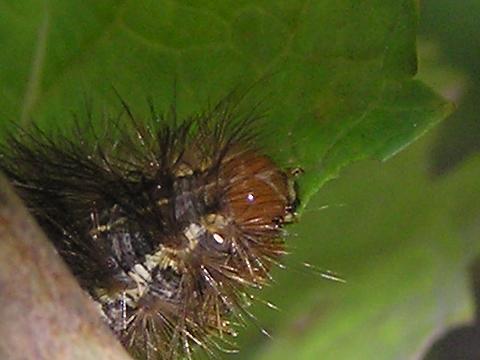 科名 シャチホコガ科 学名 Phalera flavescens 中名 黒紋天社蛾、蘋掌舟蛾 撮影日 2003/09/17 撮影地 東京都台東区 特徴 ・体長 50mm くらい、体は黒っぽい ・黄みがかった白い毛がまばらに生える ・サクラなどバラ科の植物につく 若齢幼虫はえんじ色で頭が黒く、白い毛が生えている。頭と尻をあげて舟形のポーズをとる。