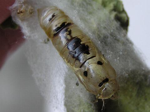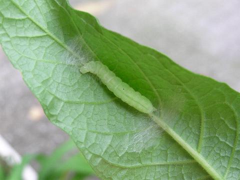 科名 ヤガ科 学名 Argyrogramma agnata 中名 銀紋夜蛾 撮影日 2003/10/31 撮影地 東京都江戸川区 特徴 ・体長 50mm 程度 ・緑色の体、白く細かい縦線 ・尻が高く、頭の方へ先細る体型 ・食べているのはチョウセンアサガオの葉 ・地上で粗い繭を作る ・腹脚が 2 対 他の写真 [1][2][3] 繭を作りはじめた
