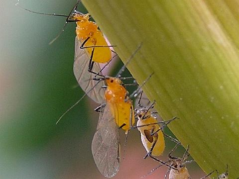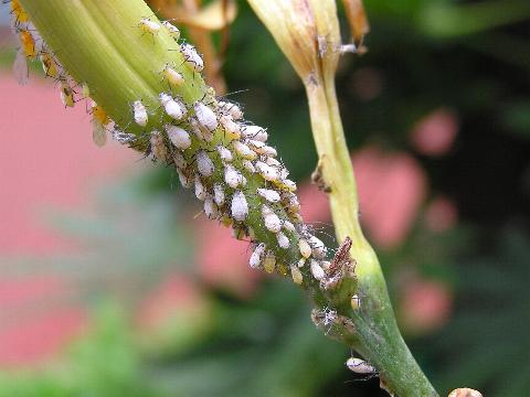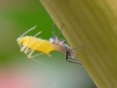 科名 アブラムシ科 学名 Indomegoura indica 中名 ? 撮影日 2003/07/28 撮影地 東京都江戸川区 特徴 ・ユリに寄生している ・有翅型はオレンジ色の体 ・無翅型は白い粉をふく ・足と触覚が黒い 似たものにニワトコフクレアブラムシ等がいて見分け方がよくわからない。ホストがユリなのも腑に落ちない。